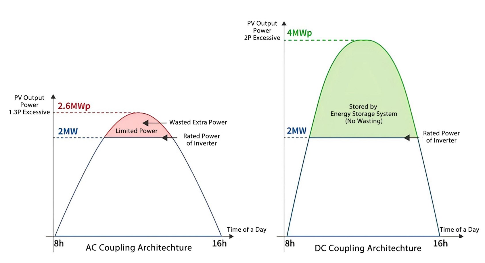 AC Coupling: PV generation is primarily limited by the PV inverter's capacity. With a 1.3 DC-to-AC ratio, a 2.6MWp PV array might be installed. If it generates 2.3MW DC, the 2MW AC PV inverter would constrain the output, causing the system to curtail PV generation and resulting in wasted solar energy.