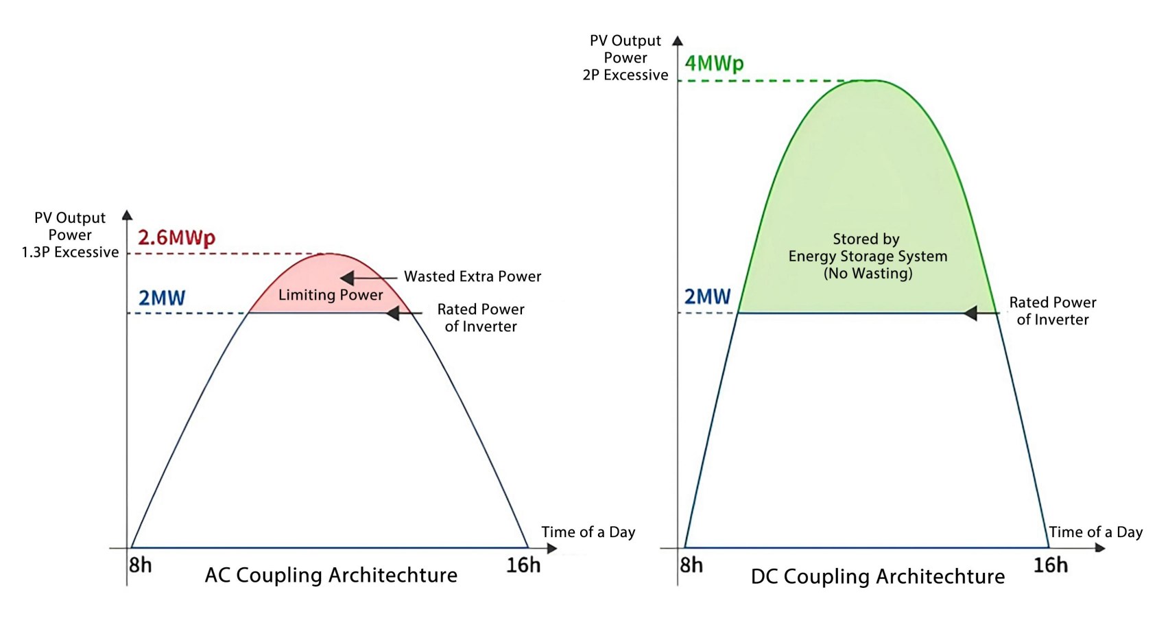 AC Coupling: PV generation is primarily limited by the PV inverter's capacity. With a 1.3 DC-to-AC ratio, a 2.6MWp PV array might be installed. If it generates 2.3MW DC, the 2MW AC PV inverter would constrain the output, causing the system to curtail PV generation and resulting in wasted solar energy.